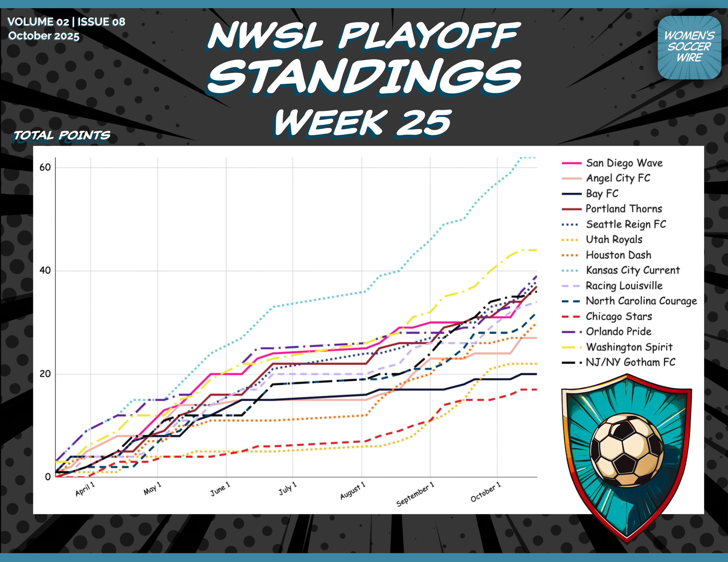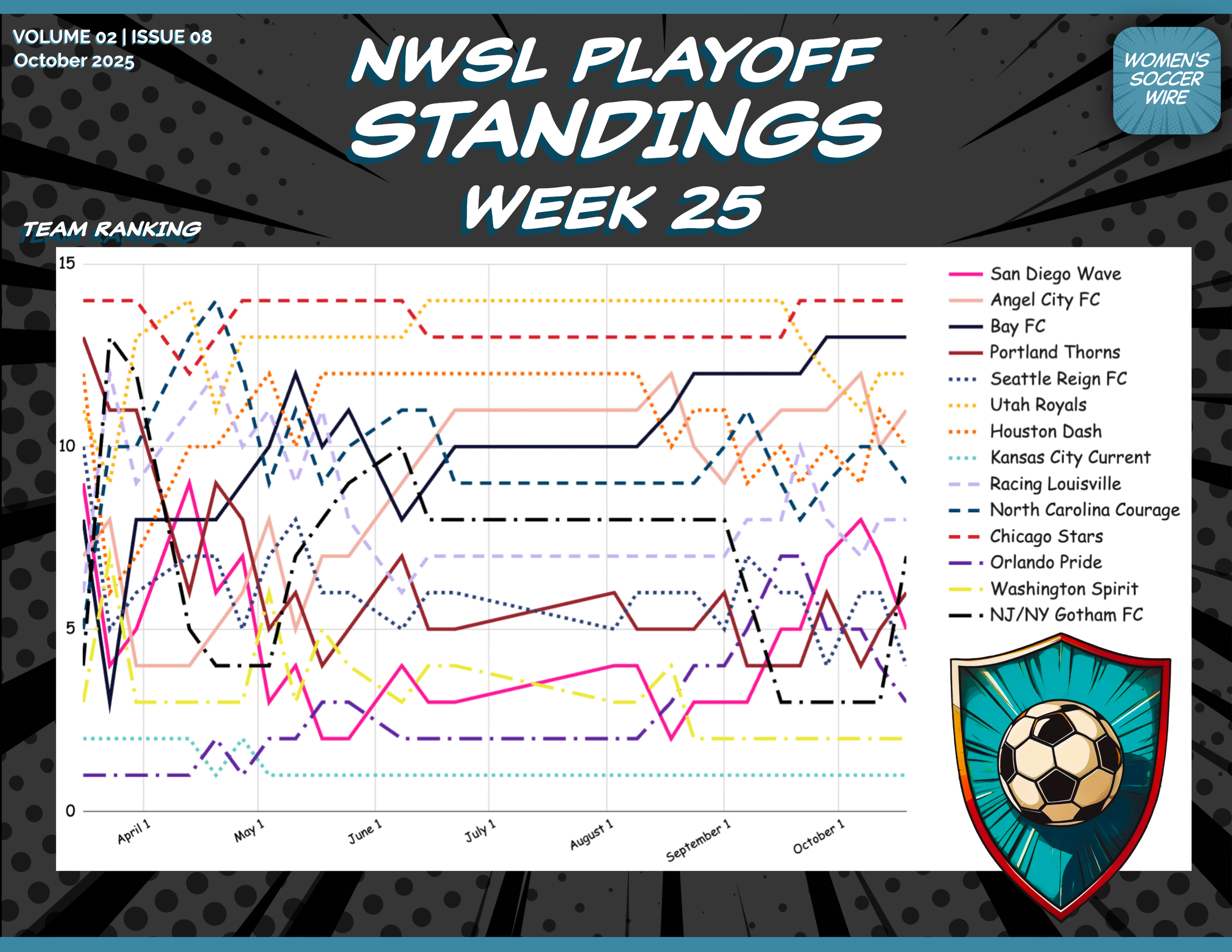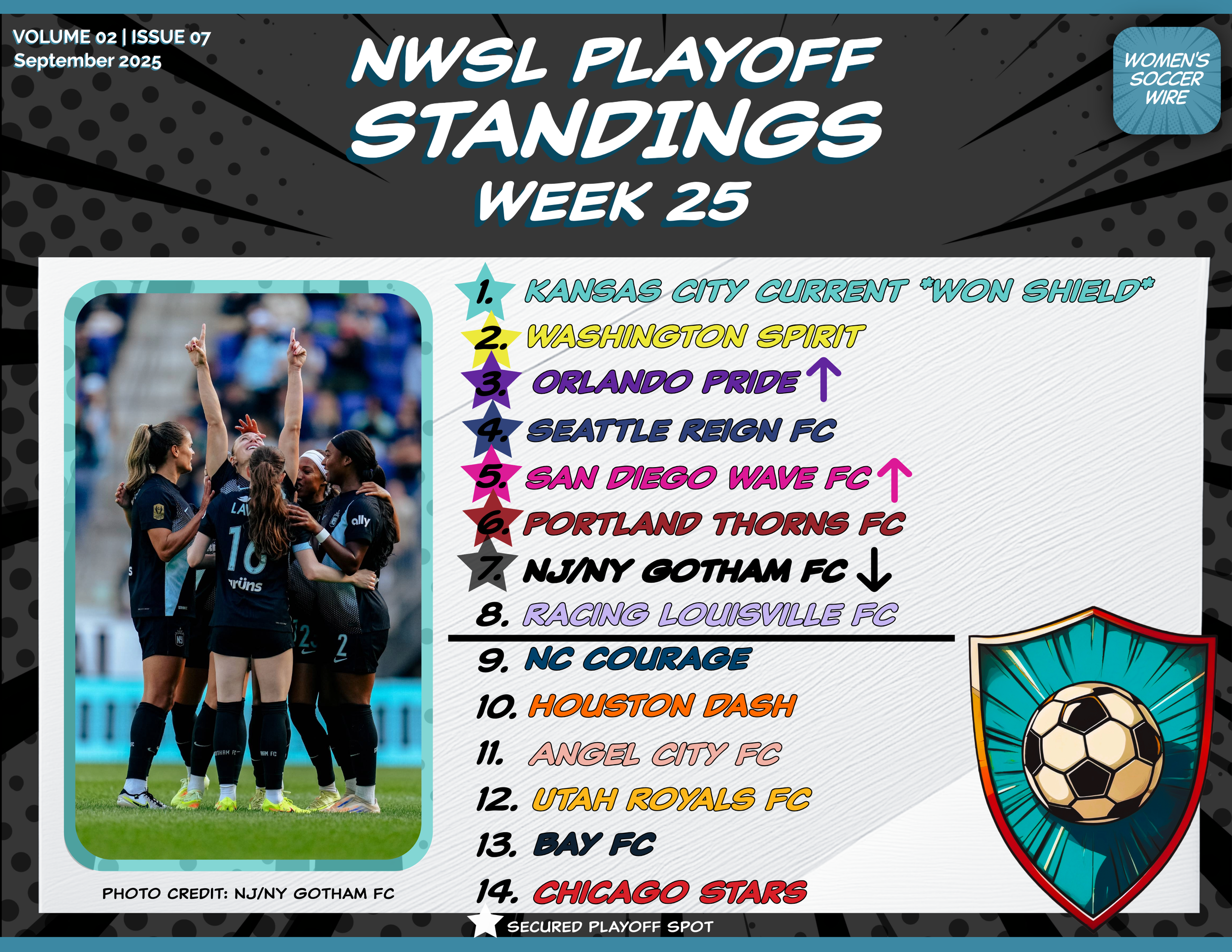 The first two playoff seeds are firmly secured by the Kansas City Current (1) and the Washington Spirit (2), giving each team home-field advantage for the start of the playoffs. The two remaining home-field seeds will be determined on Decision Day, going to the third- and fourth-place teams.