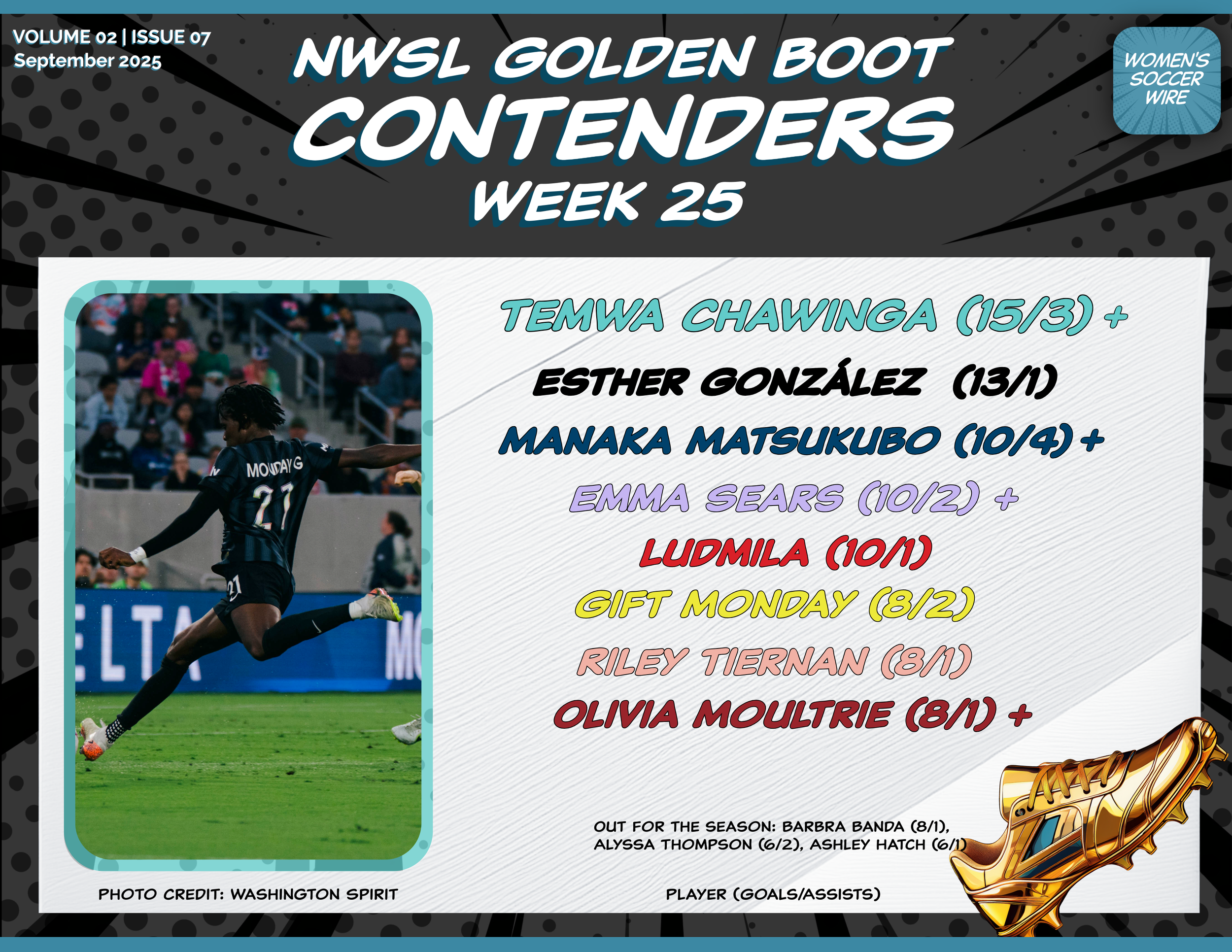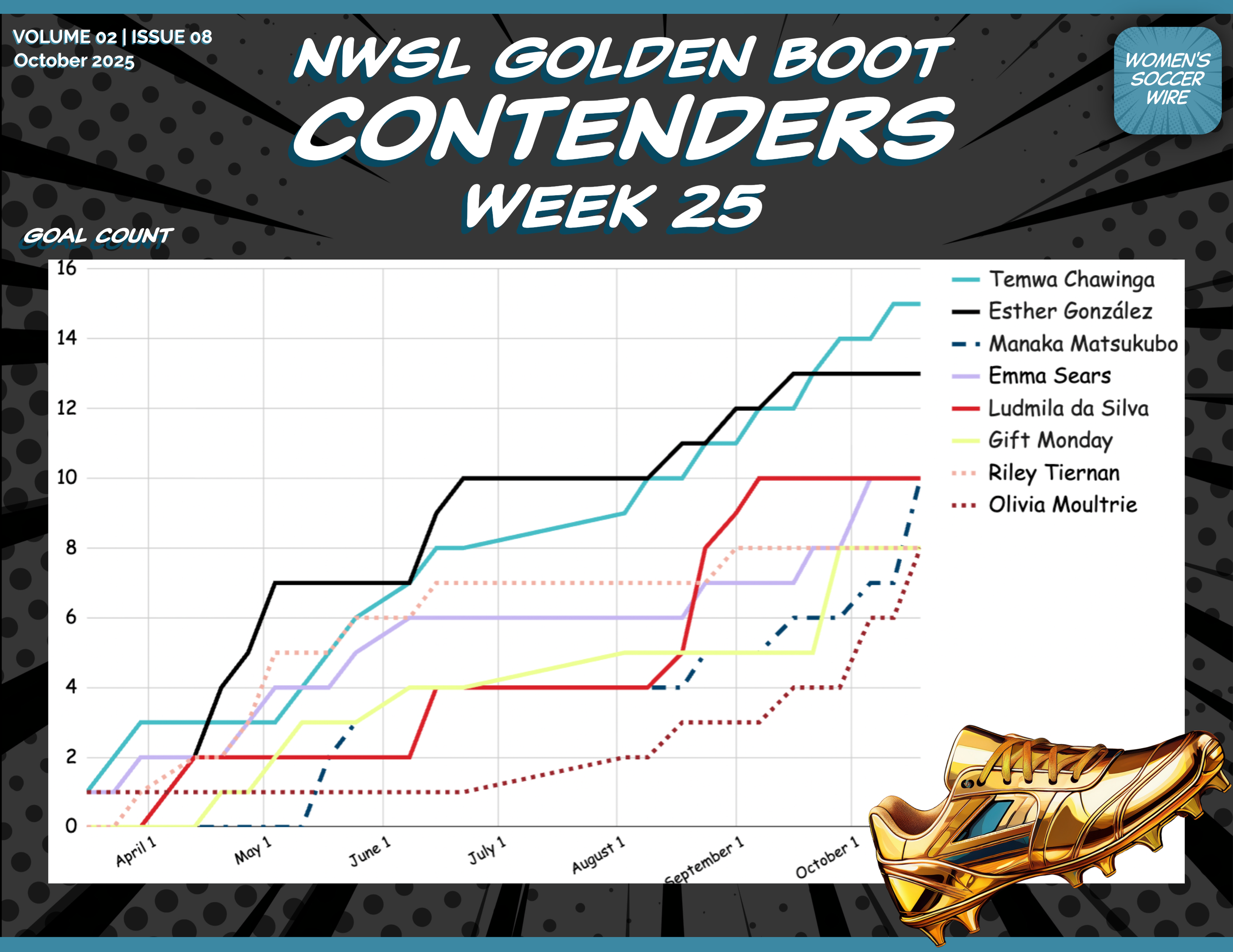Temwa Chawinga holds a two-goal lead in the race for the NWSL Golden Boot at the end of Week 25 of NWSL play with 15 goals and 3 assists.